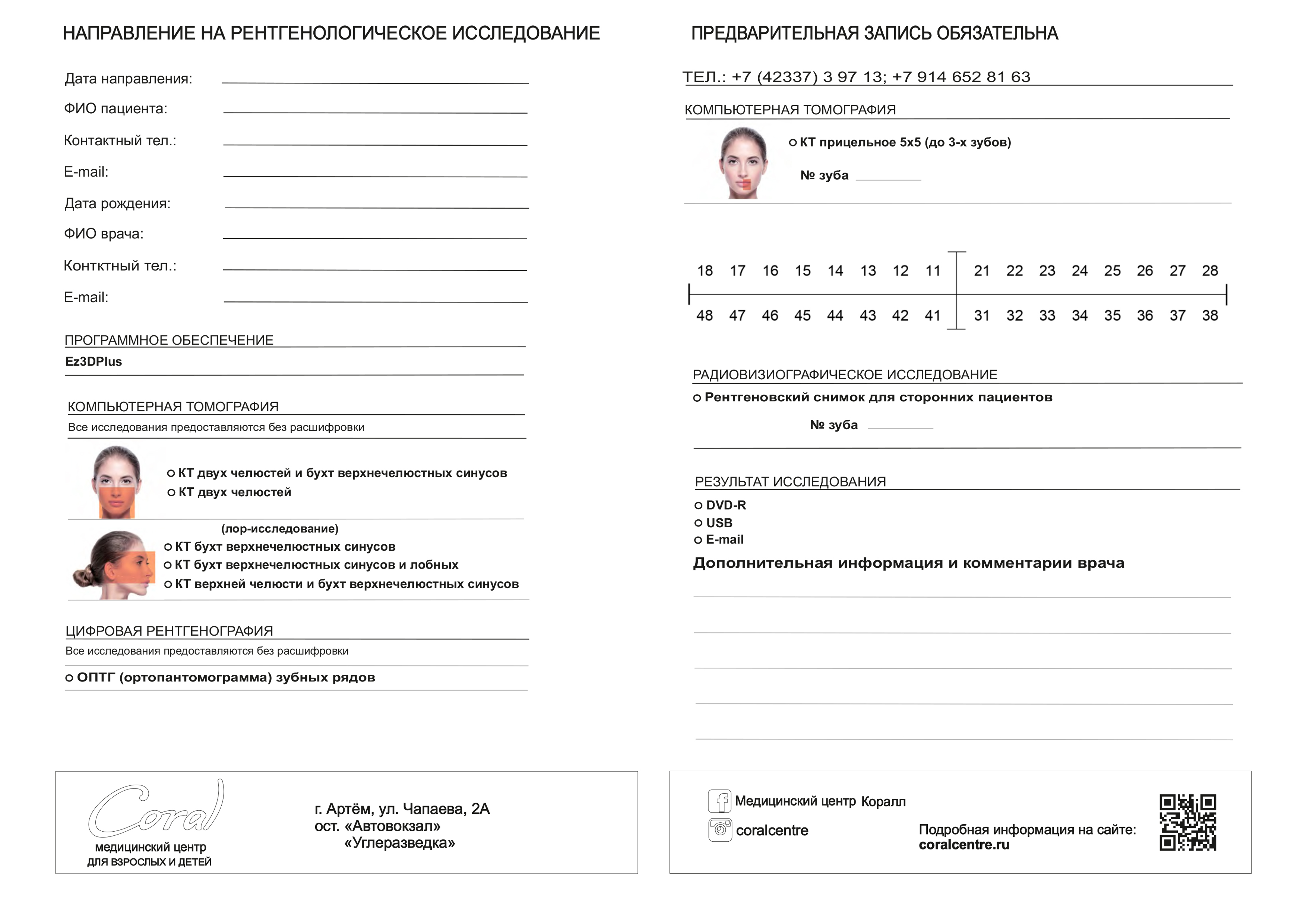 Для выполнения рентгенологических исследований желательно иметь направление врача, бланк которого можно скачать на нашем сайте.